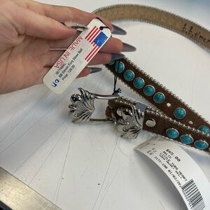 Elegant brown belt featuring vibrant turquoise stones. Perfect for a stylish touch.