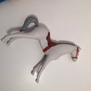 • Horse features painted white spots and a brown bridle and saddle