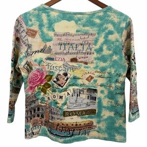 Bellissima! Transport yourself to Italy with this stunning vintage 3/4 sleeve top from Take Two Clothing Co. This "Art to Wear" piece features a vibrant, all-over collage print celebrating the beauty of Roma, Venezia, and Tuscany.