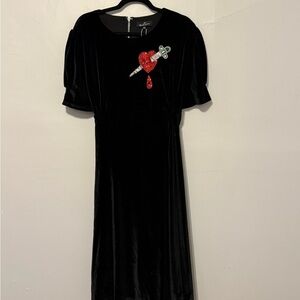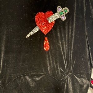 An absolute vintage style stunner - stretchy lined black velvet with 40s style silhouette (see pics for the details at sleeves and waist) and gorgeous sequin and rhinestone dagger detail at chest. Perfect for an old Hollywood, glam, rockabilly, witchy, vampire look. Measures 22” across chest, 19” across waist, and 44” from shoulder to hem. Material has a little bit of stretch and has ties at the waist for a custom fit. Labeled 2XL, NWT