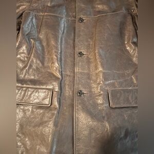 This beautiful jacket is in great condition. Jacket is made with cowhide body leather and the lining is primarily composed of acrylic, polyester and wool. Length of jacket from shoulder seam to bottom is about 32.5”. Sleeve length from shoulder is 25”. Jacket had a front button closure a two front pockets.