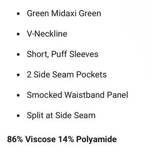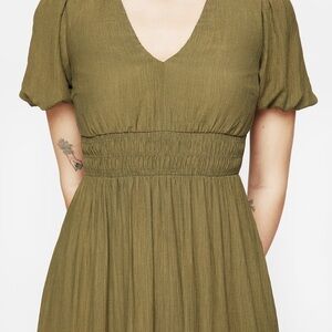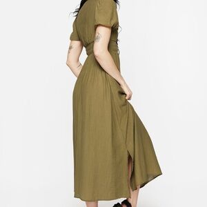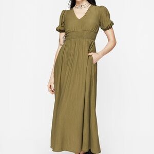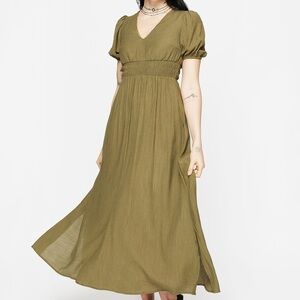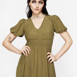New with tags! The fit is a bit too tight on me. US size 6. Elegant olive green midaxi (between a midi and a maxi) dress. Features a shirred V-neck and puff short sleeves. It has pockets! Black belt NOT included. Fits a smaller chest. Sold out on the Disturbia website.