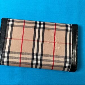 Elegant Burberry wallet with iconic plaid pattern. Features black leather trim and red stripes.