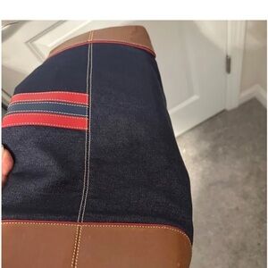 Amazing Condition! Stylish oversized Coach Weekender tote with denim body and brown leather trim. Features red stripe detail. INCLUDES TAN LEATHER HANGTAG.