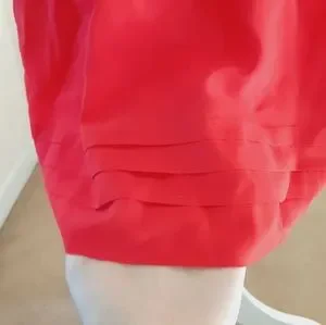 This is a flame red fully lined dress with pleated detail from White House Black Market. It is a size XS and is 100% viscose (shell and lining). Elastic waist, keyhole in back, usable pockets. Small hole in the front (see final photo), excellent condition otherwise.