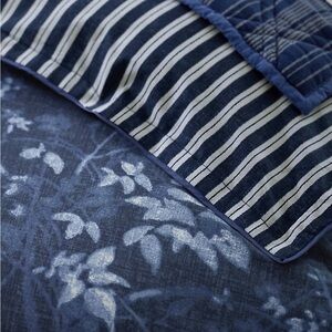 Rendered on cotton percale, the Caterina duvet cover set offers a striking interpretation of classic blue-and-white florals with youthful tossed botanicals printed across a rich indigo ground.