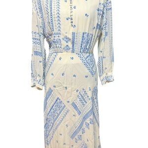 Ba&Sh Ines Printed Midi Dress in Cream and Blue Viscose