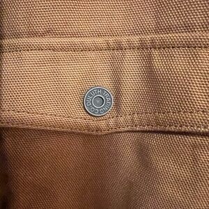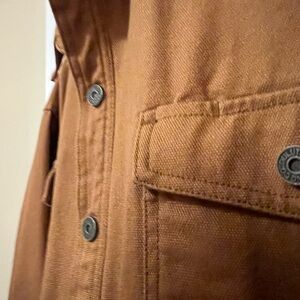 Versatile weighted shirt jacket with rugged wear outside and soft and warm gray flannel feel inside. Features button closure and dual chest pockets. Ideal for layering. Inside pocket is great for cell phone and sleeves have two choices for buttoning around wrist. Only worn a couple times, excellent condition other than one very small spot on back which is shown in photo. Non-smoking & no pet home.
