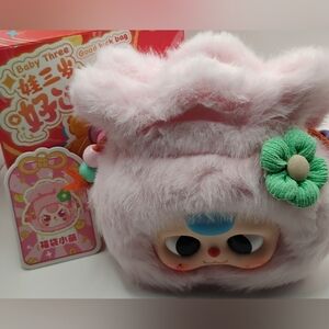 Adorable baby 3 good luck bag is a fluffy bag with a cute character design. Features a pink and white color scheme with a green flower accent.