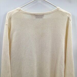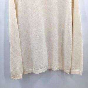 A pretty vintage winter or spring sweater by Elizabeth (Liz Claiborne) in their special women's plus sizing, size "1." I believe this equates to approximately 1X, but please check the measurements below to ensure fit. Features easy pullover style, long sleeves, and very soft, smooth material that is breathable and great for layering/office looks, dress up or down. It has gold colored floral embroidery on it and iridescent sequin accents. Base color is ivory.