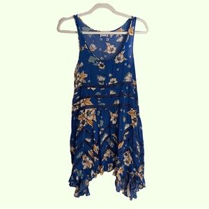 Free People Intimately blue mini dress with floral pattern with sheer lace insets. Sleeveless design. Loose, flowy, and effortless. Throw on over a bikini at the beach or the pool on vacation.