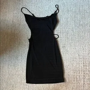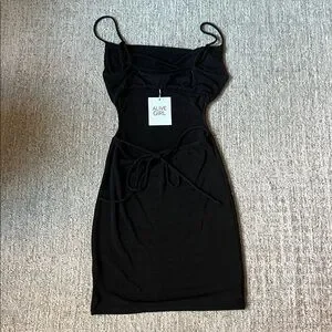 Cut out back with tie, adjustable straps, very stretchy material, very flattering, never worn
