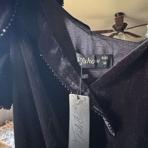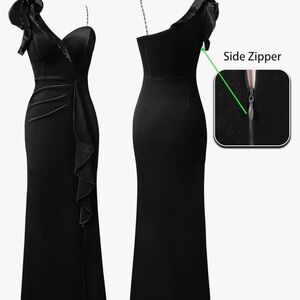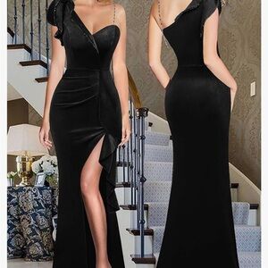 This stunning black velvet one-shoulder ruffle evening Beaded strap-dress is perfect for any formal occasion. The sleek design and elegant silhouette make it a must-have for your wardrobe.