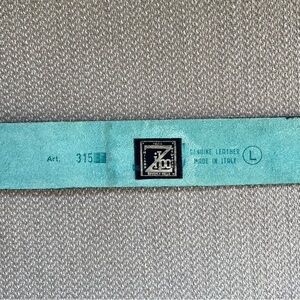 Unique vintage “Zibo” blue leather belt with silver snake buckle and snake tail detail. Leather is embossed with floral design. In good pre-owned condition.