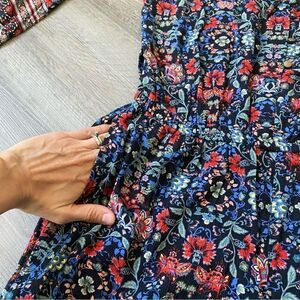 This American Eagle romper pairs comfort with girly style and it has pockets! Long sleeves with elastic cuffs + an elastic waist. Size medium. Beautiful florals in navy blue, medium blue, red, green with touches of taupe and yellow. Ruffle trim