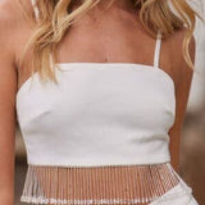 Stylish white crop top with fringe accents. Perfect for any occasion.