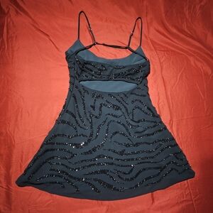 Stunning black mini dress by Oh Polly. Perfect for a night out. It is beaded in a tiger/zebra print fashion. Has adjustable straps across the back and a discreet side zipper. I love this dress but it was a bit too large for me, so it is unworn. Has a cutout on the back.