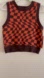 Stylish checkered vest. Features bold orange and brown pattern. Sleeveless design. Perfect for layering.