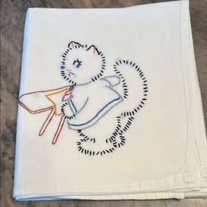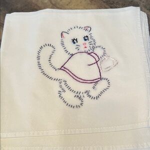 Add charm to your kitchen with this set of 6 embroidered cat kitchen towels. Featuring delightful cat designs in various colors, these towels are perfect for any cat lover. Made from quality materials, they are both decorative and functional. Towels measure 31” x 37”, embroidered designs average 6” x 6”. This set has never been used.