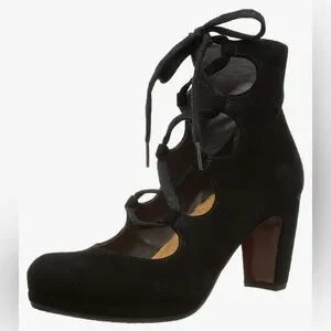 This striking style features a black suede (ante) upper, elegant cutout detailing, and a lace-up front, creating a bold yet refined silhouette. The rounded toe and block heel offer both stability and comfort—hallmarks of the Chie Mihara brand.