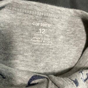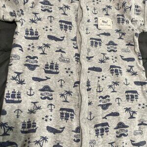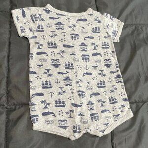 Gray cotton snap up baby romper with pirate pattern, “mommy’s first mate”. By Carter’s size 12M. Comfy material in great condition!