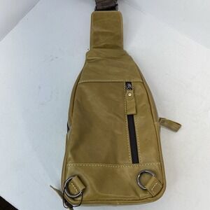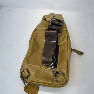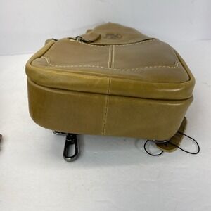 This Men's Genuine Leather Sling Backpack Crossbody Bag by Laoshiki is perfect for hiking with its adjustable straps, anti-theft design, and audio pocket features. Crafted from soft cowhide leather with a gun metal gray hardware color, this medium-sized bag in a stylish gold color is ideal for casual occasions. The bag includes three outside pockets, a buckle and zipper closure, and a durable polyester lining. With a vintage design and a sling bag theme, this versatile backpack is both functional and fashionable for outdoor adventures.
