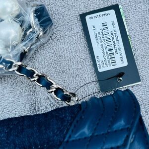 This cute denim blue handbag is perfect for adding a touch of glamour to any outfit. Its elegant design make it a standout accessory for any occasion. Gold hardware & studs. MSRP $129.