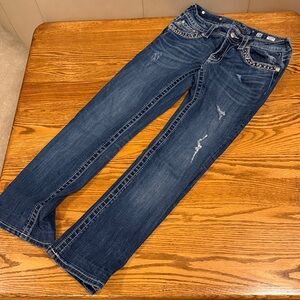 Miss Me Signature Boot Cut Jeans - medium wash with embroidered sequins and a touch of bling, good used condition, originally 34” inseam but have been professionally shortened to a 27” inseam, see photos for details - women’s size 28/27