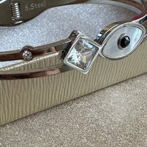 Stainless steel hinged bracelet with mother of pearl evil eye detail.