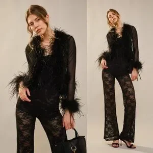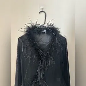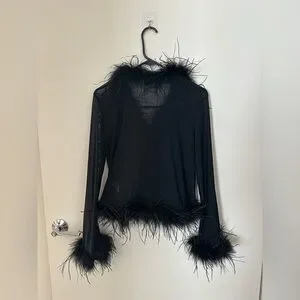 Elevate your style with this elegant black feathered top. Perfect for a night out, this top combines sophistication with a touch of flair. The black color adds a classic and versatile touch to your wardrobe.