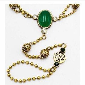 Stylish hand chain bracelet with a striking green stone. Perfect for a chic look.