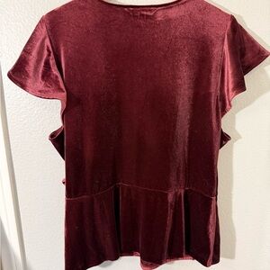 Chic velvet wrap top in a deep burgundy hue. Features flutter sleeves and a tie waist.
