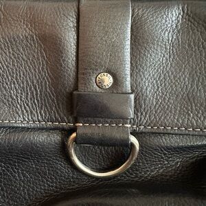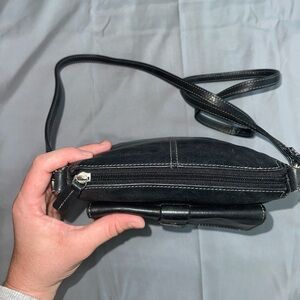 Sleek and stylish black leather crossbody bag, perfect for any occasion. Silver hardware. Gently used, some signs of wear, see photos.