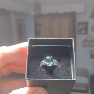 This stunning silver ring features a captivating blue gemstone, perfect for adding a touch of elegance to any outfit. White gold plated over 925 RT. Topaz and channeled tanzanite.