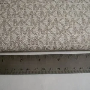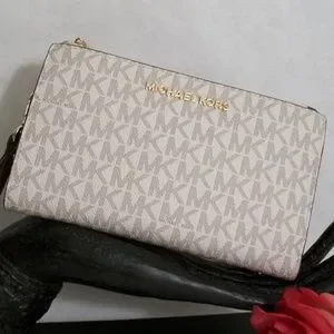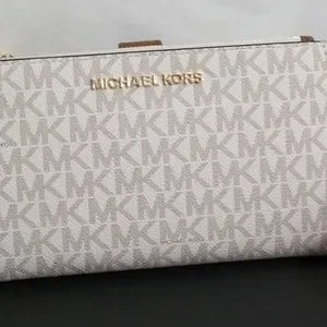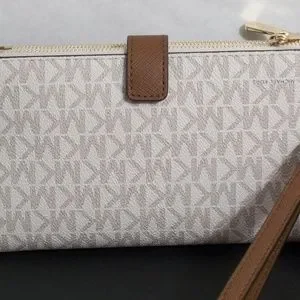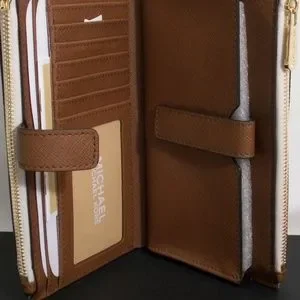 Michael Kors Smart Phone Wallet, In the logo design with gold accents, two zipper compartments, 6 credit card slots, smartphone pocket snap closure, and wrist strap. measures 7 1/4" X 4". A beautiful wallet you want to carry.