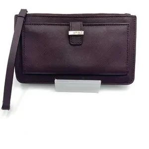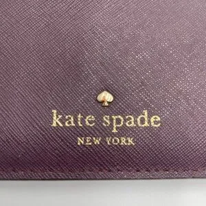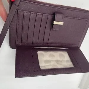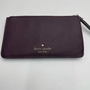 Chic Kate Spade writslet wallet in deep aubergine. Features gold logo detailing.