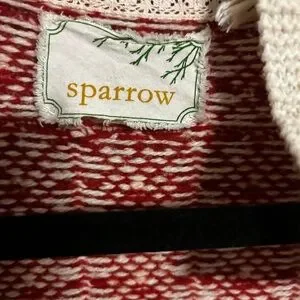 Chic red and cream cardigan by Sparrow. Features intricate patterns. Ideal for layering.