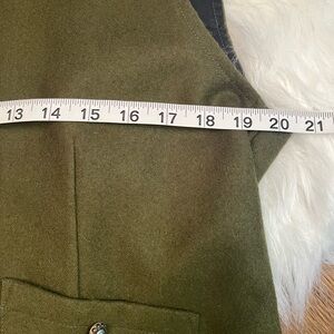 Gorgeous olive green wool western style vest. Made to order in the USA by Cattle Kate. Worn once, too big for me. Wear with a skirt or jeans or wear over a show shirt to show in. Beautiful buttons, real pockets and a cinch in the back to contour your waist. Dry clean only.