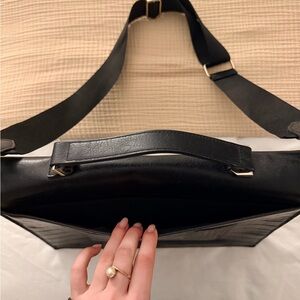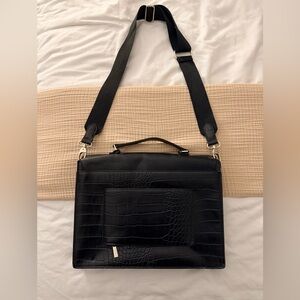 Stylish black laptop bag by BEIS. Features croc-embossed design. Includes adjustable shoulder strap and top handle. Sleek and professional look.