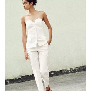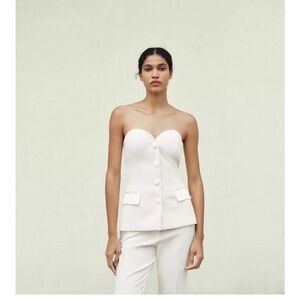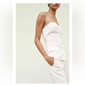 Elegant and structured, this crisp white satin bustier top from Zara features a strapless neckline, sculpted bodice, front dart details, and faux flap pockets for a sleek, tailored finish. Hidden back zipper for a seamless look.