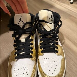Stylish Jordan sneakers. Gold and white design. Iconic logo on the side. Comfortable fit.