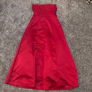 Chic strapless design. Rich scarlet red hue. Perfect for formal events.