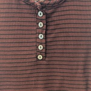 Chic burgundy top with horizontal stripes. Features button accents. Ideal for casual wear.fair condition. size small.