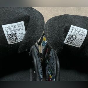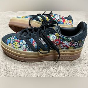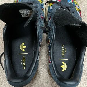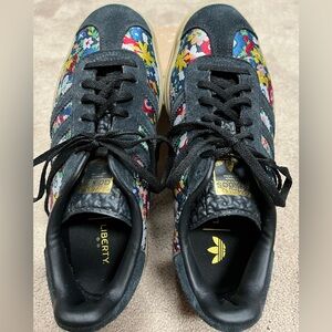 Limited edition, stylish adidas sneakers with vibrant floral patterns. Platform sneaker with gum rubber sole. Black/dark navy suede base with colorful accents. Comfortable and trendy design. Worn only a few times. Great condition.