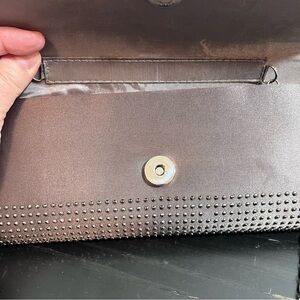 Elevate your evening look with this stunning gunmetal grey satin clutch. Featuring a sleek envelope silhouette, the exterior is meticulously adorned with rows of metallic studs that add a sophisticated edge and subtle sparkle to any formal outfit.