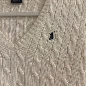Classic white cable knit design. V-neck style. Iconic Ralph Lauren logo in navy blue. Excellent condition, no signs of wear.
