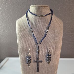 Blue and Silver Beaded Necklace and Earring Set With Cross Pendant