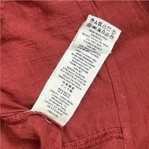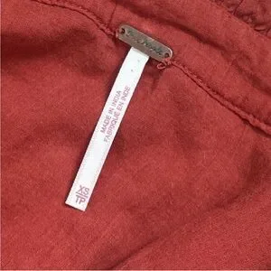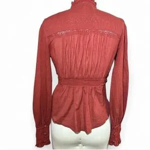 Chic rust blouse with lace accents. Features button-up front and tie waist. Ideal for stylish layering.