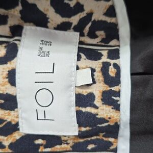 This is a FOIL brand women's blazer, size 10 featuring a brown and black leopard print with vertical white stripes. It has a double-breasted front closure with two black buttons and a notched lapel collar. The blazer includes two visible front flap pockets and a black interior lining. No significant imperfections or signs of wear are visible.