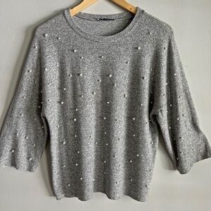 Zara Gray Pearl Embellished Knit Sweater Top Women’s Size S Minimalist Chic